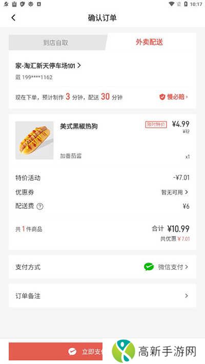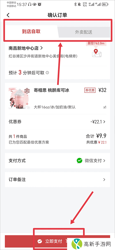 3、最后在确认订单界面中选择到店自取或外卖配送,然后完成支付即可