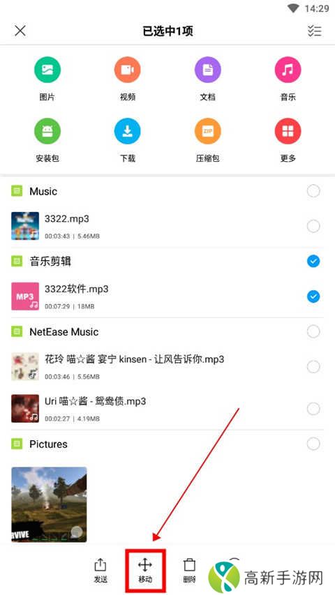 1、下载好app后,进入app就可以看到所有文件图片以分类显示好了,选择一个要移动的软件,将右边的选项勾选。