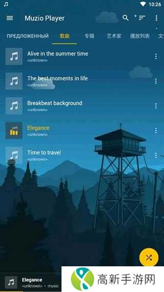 选择好主题之后,紧接着便来到了音乐播放器的主界面,在这里你可以选择自己喜欢的歌曲、专辑、艺术家,也可以查看当前的播放列表。