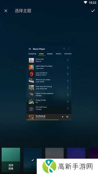 初始运行状态下,用户可根据自己喜好设置主题,由系统提供的数十款不同主题选择,基本能满足大量用户的需要,或者你也可以选择自己手机里的预存图片来打造个性化音乐播放器,在主题的后面,针对音乐播放器的颜色也有多项提供,喜欢的朋友可千万不要忘记哦。