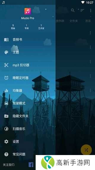 在左上角的三道横杆中,可以查看当前歌曲、专辑和艺术家的数量,同时音频书、主题、mp3剪切器、睡眠定时器、均衡器以及驾驶模式、隐藏文件夹、扫描音乐和基本设置、常见问题都能在此界面中进行自定义修改。