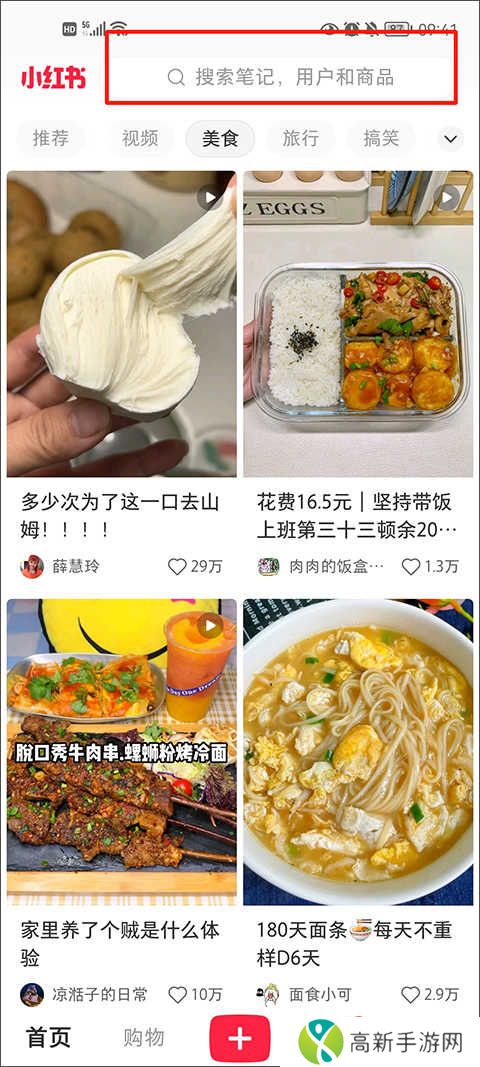 2、进入到软件后,可以选择上面的美食,进入到美食页面,就可以看到很多的美食分享,也可以选择右上角来搜索你想了解的美食。
