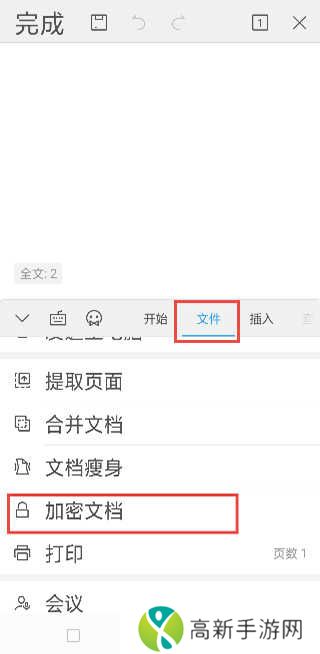 2、已有文档打开后,点击下方工具栏,找到「 文件」下拉,找到「加密文档」,即可进行加密设置