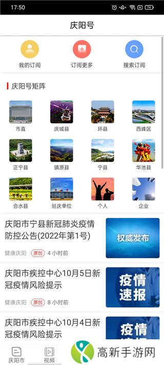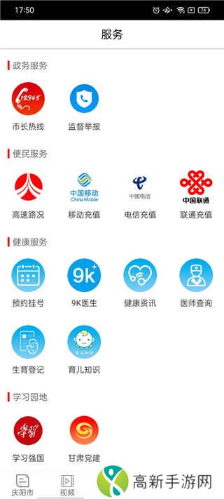 2.进入首页,我们可以看见庆阳市、视频、服务、庆阳号、我的五大板块;