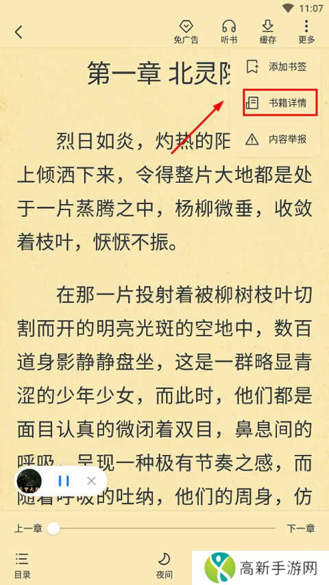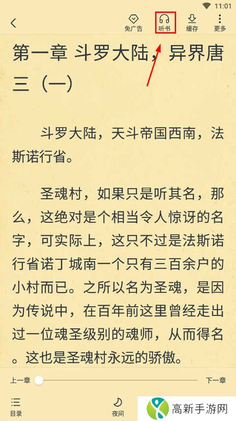2.打开小说后,点击屏幕中间,然后点击右上角听书;