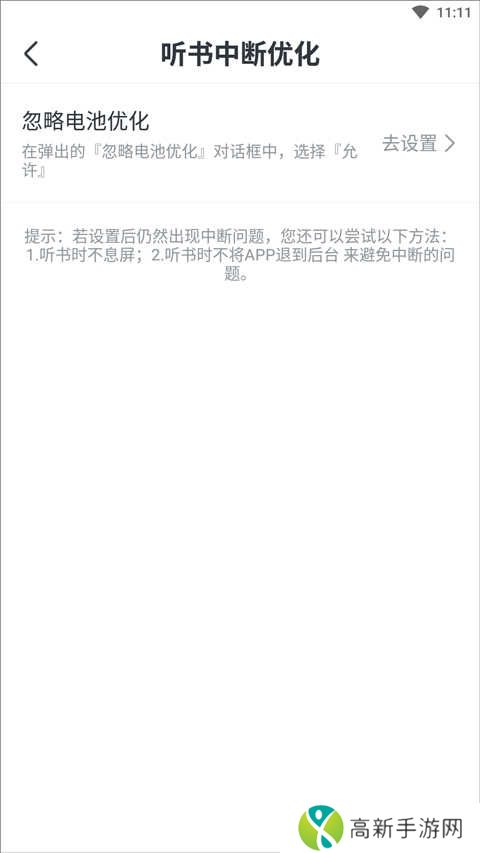 3.进入听书界面,点击“中断优化”设置项。