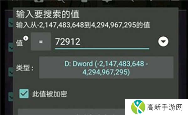 3、搜索你游戏现在的金币数量,并且勾选此值被加密;