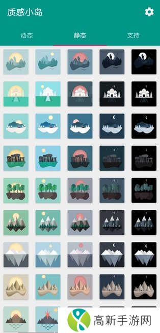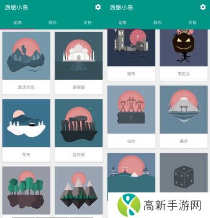 2、内置了 6 种不同的动态主题,分别是:雪山之岛、冰山之岛、沙漠之岛、熔岩之岛、天堂之岛和都市之岛。所有壁纸均采用 MD 设计,构图简约,本站优美,简单点击即可设定为当前壁纸