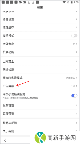 3、往下翻,会看到一个功能“广告屏蔽”,点击进去。