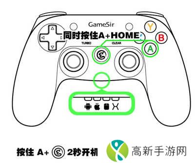 a、同时按住手柄的【A】和【HOME】键2秒开机,安卓指示灯进入闪烁状态;