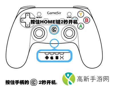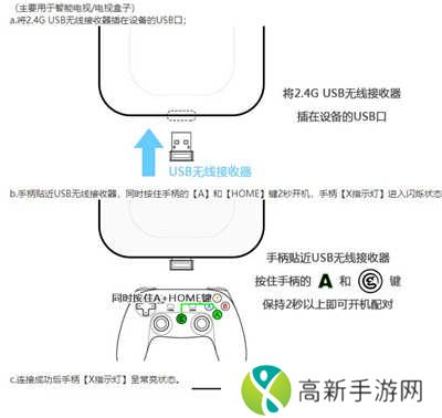 a、按住手柄【HOME】键2秒开机,指示灯进入闪烁状态;