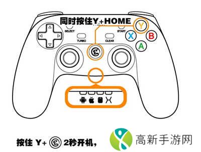 b、同时按住手柄的【Y】和【HOME】键2秒开机,【苹果指示灯】进入闪烁状态;