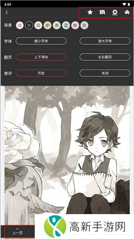 3、进入到阅读界面之后,再次点击屏幕,会弹出很多的选项,下方用来控制页面的翻页,上方则提供收藏、书架、设置以及首页按钮。如果对界面不喜欢,还可以修改背景、调整字体大小等。