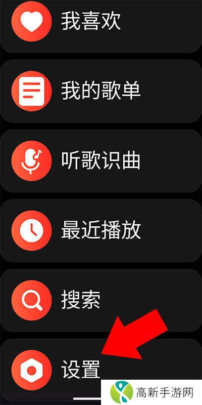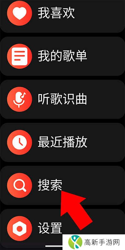 1、打开网易云音乐手表版并点击右上角的三条杠符号进入菜单界面后,往下滑找到搜索按钮