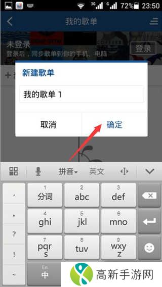 3、点击后弹出一个对话框,你可以输入歌单的名字,根据你的需要起个名字即可,输入后,点击”确定“按钮。