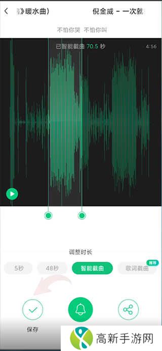 3、在点击下载并安装完应用裁剪应用之后,点击启动应用便可开始使用裁剪功能。在裁剪页面中拨动裁剪选项即可选择裁剪片段,同样也可以通过选择歌词片段来裁剪音乐,选择完成之后点击保存即可保存裁剪之后的音乐。