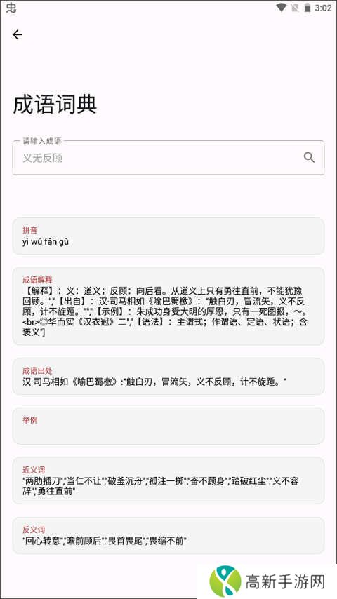 只要在输入框中搜索想要查询的成语,就可以了解它的拼音、成语解释、出处以及近义词等。