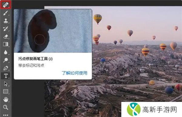 步骤一:打开软件,拖入需要去水印的图片,然后点击左边工具栏中的【污点修复画笔工具】,对需要去除的区域进行涂抹即可。