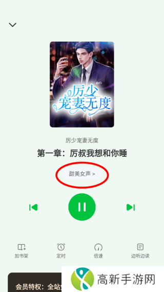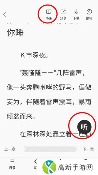 4、点击上方的书架可以将小说加入自己的书架,点击“听”可以开始听书;