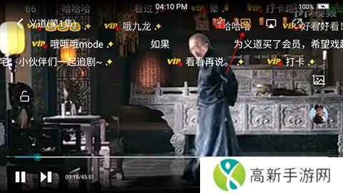 2、接着在横屏播放页面中点击任意位置,这时在播放页面顶部右侧会出现一个橙色的弹幕图标(下图红色箭头所指)橙色代表弹幕是开启状态,用户点击这个图标就会关闭弹幕