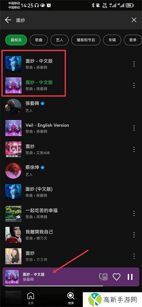 2、搜索结果出来后点击你收听的歌曲,播放后点击下方的歌曲进入播放界面