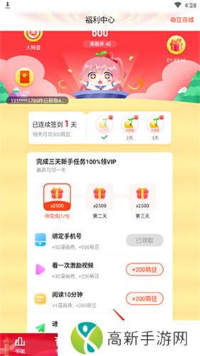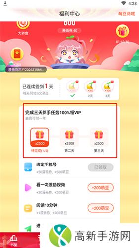 2、进入福利中心,你可以通过完成三天新手任务100%领取VIP。
