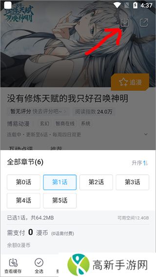 就可以看到有缓存按钮了,下图红色箭头所指 选择下部分章节就可以免费缓存了;
