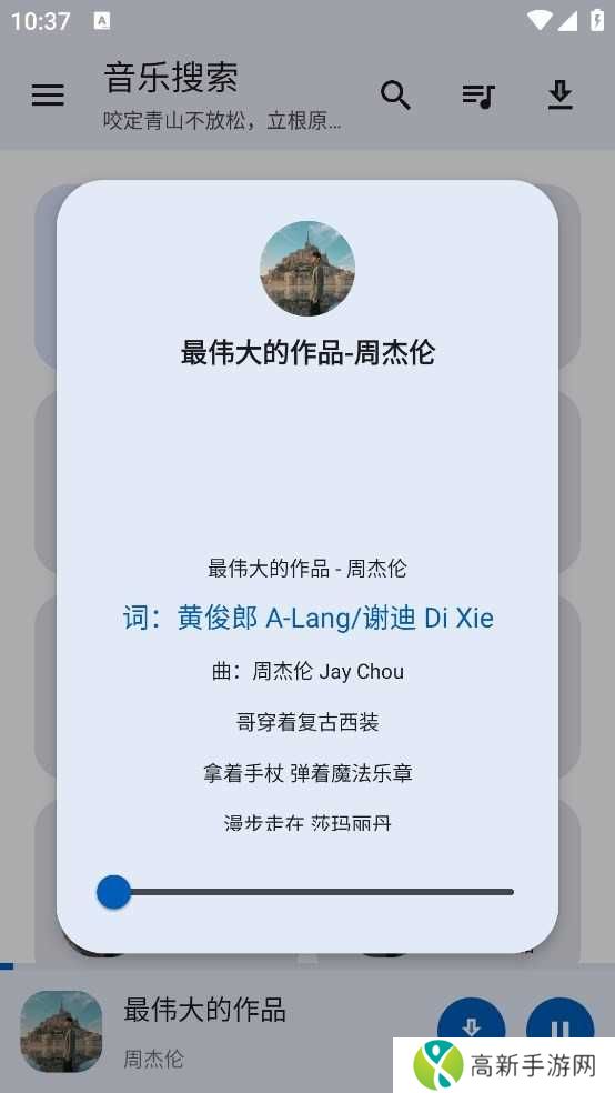 4、如果你搜想听的歌,比如周杰伦的《最伟大的作品》,可以看到搜索出来的不仅有《最伟大的作品》,连同一个专辑里的歌都有,十分的智能方便