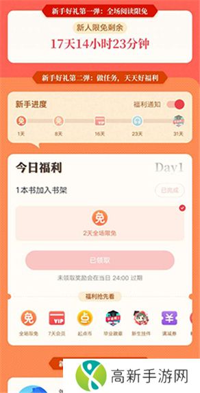 1、在起点中文网软件中新人是有签到福利的,可以领取全场小说阅读限免的权限,在首页有一个很大的新人福利按钮,点击进入。