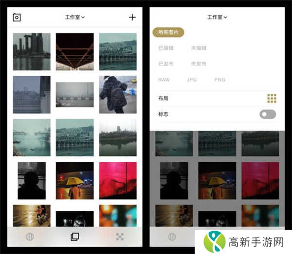 工作室页面是默认情况下打开的首页。点击顶部的「工作室」可以布局方式以及显示的图片类别进行调整。