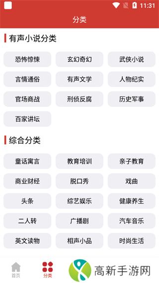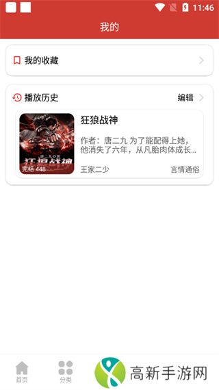 4、分类当中拥有小说分类和综合分类以及评书分类,每个大类下面又有小种类;5、“我的”里面则是我们之前听过的历史记录,方便我们下次再听。