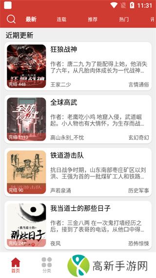 2、首页上方也有“连载”、“推荐”、“热门”以及“评书”四个选项,用户可选择自己喜欢的;3、首页没有喜欢看的话那么可以点击分类;
