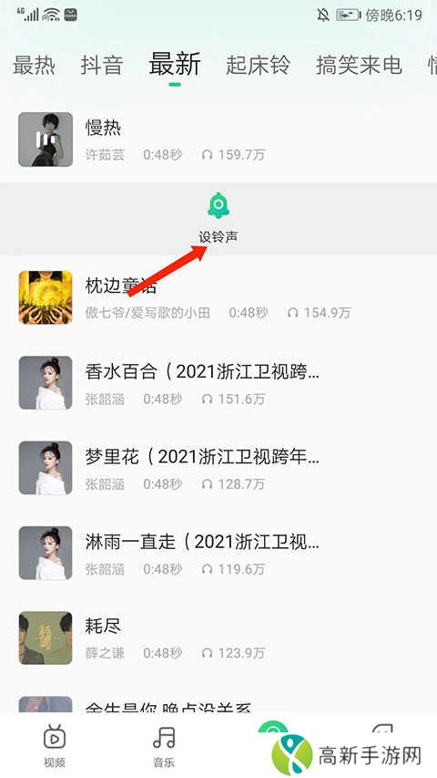 4.进入铃声界面,包括最热、抖音、最新、起床铃、搞笑来电等等不同风格的铃声,