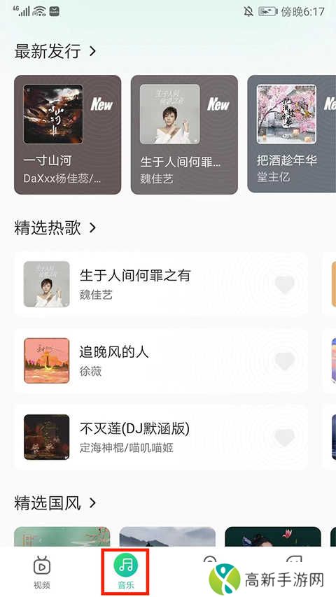 3.进入音乐界面,包括最新发布、精选热歌和精选国风等类型的音乐,点击喜欢的音乐即可进行播放,