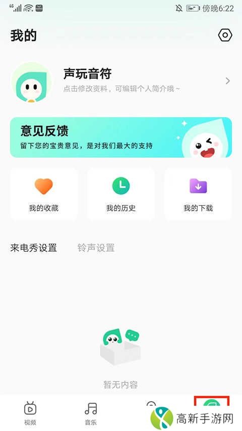 6.进入我的界面,可以查看自己的收藏、历史和下载以及进行来电秀和铃声的设置,以上就是声玩音乐安卓版的使用方法了。
