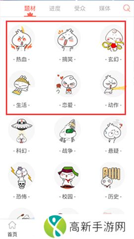 3、点开分类,有热血、高效、玄幻、生活、恋爱等多种题材的漫画;
