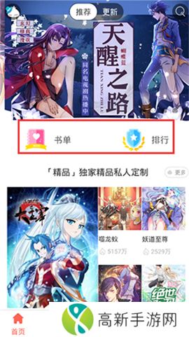 2、在首页,有书单、排行以及软件推荐的各种精品漫画;