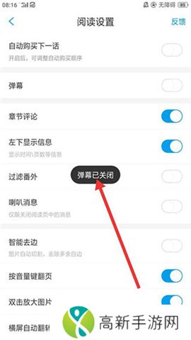 4、进入到阅读设置界面后,我们再滑动弹幕后面的滑块至灰色即可。
