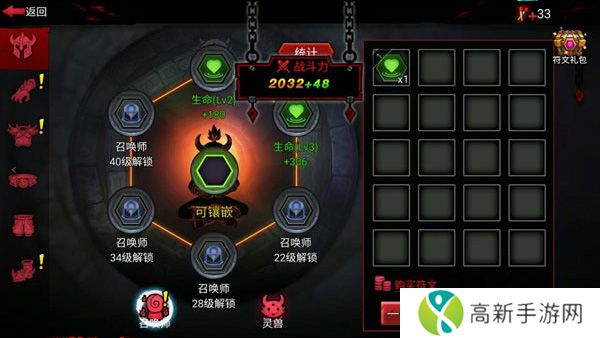 游戏的符文系统将于通关第二章第六关后解锁开启,这个时候人物等级16级一定要去把符文搞起来才能保证后面通关的顺畅!当第一次开启符文系统时,6大装备部件均已开通第一个符文插槽分别对应生命、攻击、防御、破防、暴击、抗暴6大种类符文,每件装备中间可镶嵌特殊属性符文!(PS:人物每升级一级开启一个符文插槽)