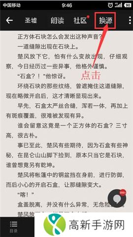 2、开始书籍阅读,点击屏幕中央,跳出功能弹框,点击“换源。