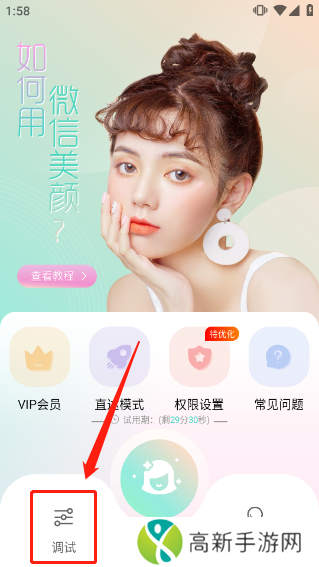 3、为了避免第一次使用时的仓促,我们可在启动微信美颜之前,点击左侧“调试”