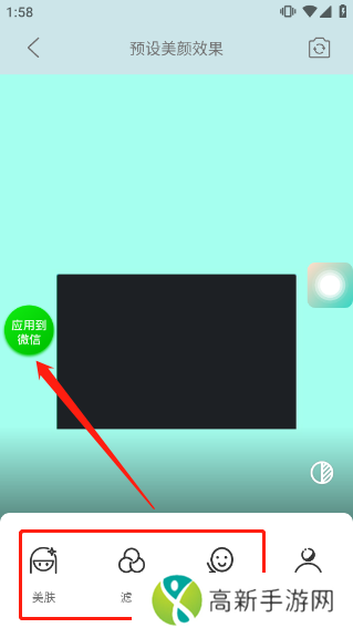 4、在其中,我们可选择各种类型的特效、滤镜、美肤等各种美颜效果,设置完成后需要点击应用到微信