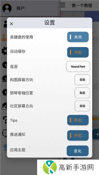 3.用户可自定义设置黑键盘的使用、自动保存、音源、构图屏幕方向、钢琴卷轴位置、主题等等;