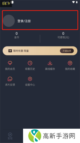 2.进入之后我们首先在【我的】页面,点击登录/注册,才能观看影片。