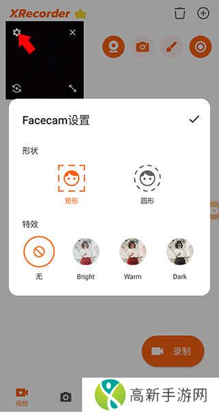 3、点击摄像头小窗后再点击左上角齿轮按钮即可设置小窗的形状以及滤镜,点击左下角按钮即可切换前/后置摄像头