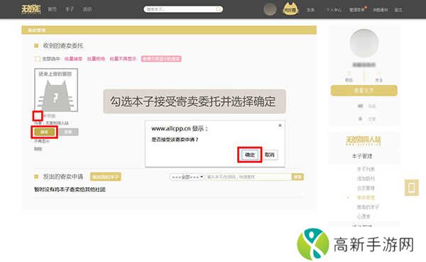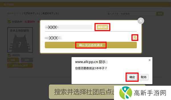 4、输入社团名或社团ID进行搜索并勾选该社团,【确认发送寄卖请求】后在弹出框内选择【确定】