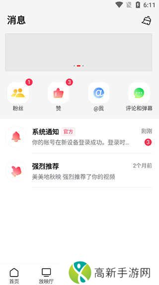 5、消息页面,可以查看消息、粉丝、点赞、@我、评论和弹幕;