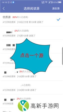 点击源后,打开选择阅读源界面,一般默认的源都是优质的,可以自己选择其他的源,点击一下就可以了。如图所示