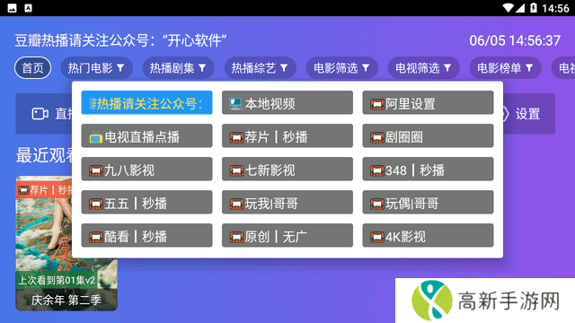 开心TV里面点击首页就会出现超多数据源,点击一个即可切换!