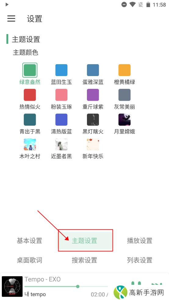 6、在设置界面就可以设置主题,设置音乐来源,设置列表随机播放、顺序播放
